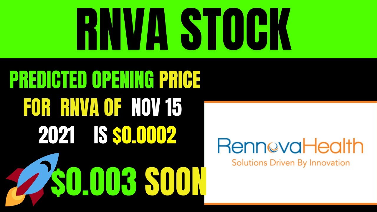 What will be the closing price of RNVA stocks? Rennova Health Stock Predictions NASDAQ:RNVA. 4 years ago JS predicted that RNVA for 2017-07-11 is going $0.42 (16.94%) 4 years ago JuanC Villegas predicted that RNVA for 2017-07-11 is going $0.36 (-10.00%) 4 years ago JWick199 predicted that RNVA for 2017-07-11 is going $0.40 (-1.25%)