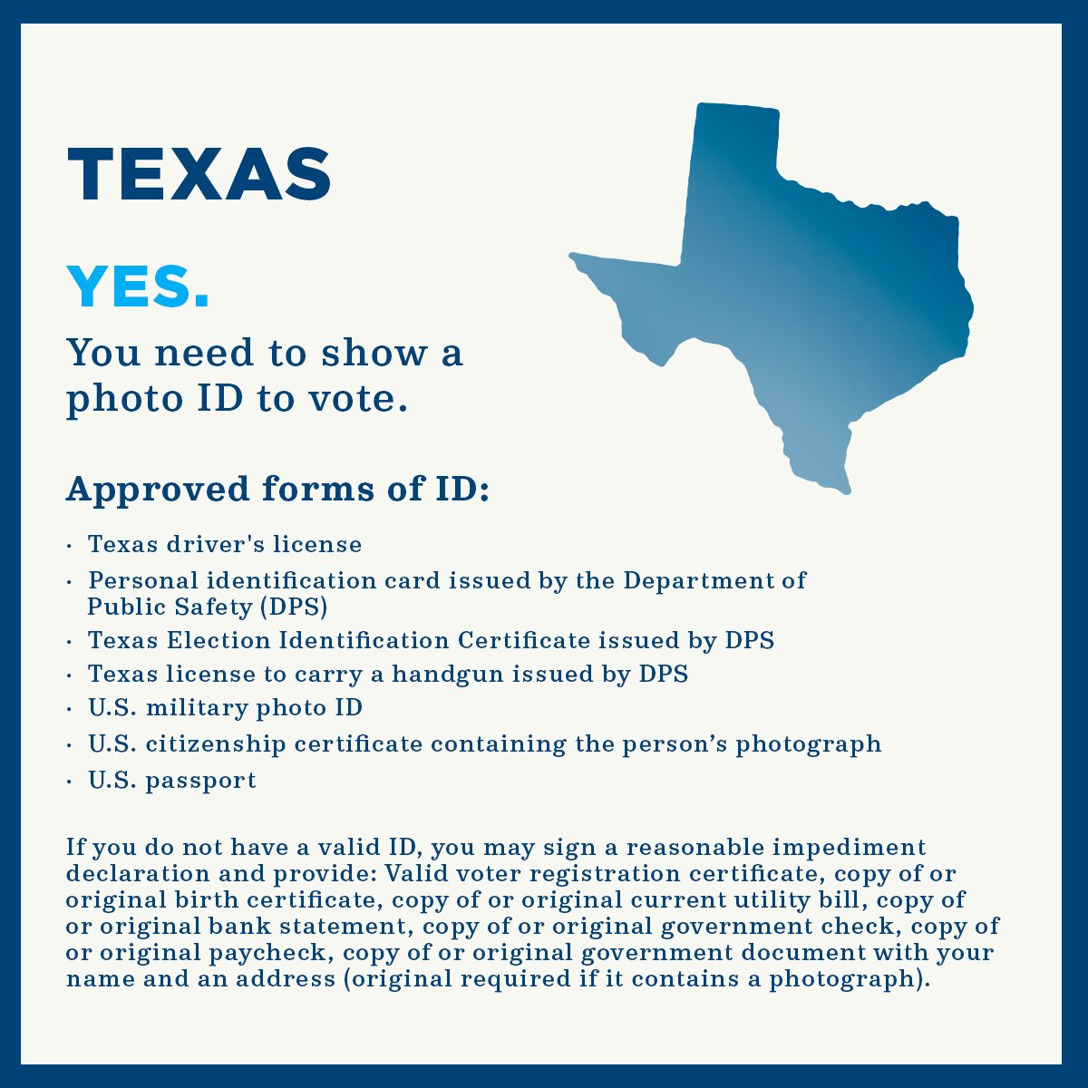 Do i need my voter registration card to vote in texas. Welcome | Official Texas Voter Registration Name & Address ... If you submit changes less than 30 days prior to an election, you must vote at your current polling location. To use this service, you need your: Current Driver License or ID Card Social Security Number Voter Registration Card VUID (Voter Unique Identifier) Number may be obtained from your County Voter Registrar. Check Your Voter Registration Status - Vote.org It takes less than 30 seconds to check your registration status with our free 50-state tool. And if you're not registered, we'll help you take care of that too. Fast, free, secure, non-partisan. ALASKA - Online Voter Registration Voter Certificate. Read: I certify, under penalty of perjury, that the above information I provided on this document is true and correct. I am not registered to vote in another state, or I have provided information to cancel that registration. How to Get a Voter Registration Card | USAGov When you register to vote, you'll be sent a voter registration card. It's a confirmation that you're registered to vote and that your voter information is correct. Your voter registration card typically includes your name, home address, and the address of the polling station where you'll vote. Open All +