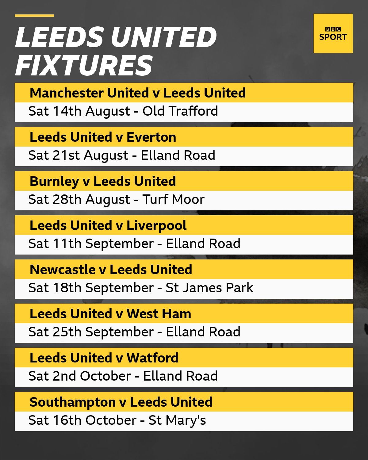 Fixtures announced for 2021/22 season - Leeds United Leeds United's 2021/22 Premier League fixtures have today been announced. The Whites will begin the campaign with an away trip to Old Trafford to face arch-rivals Manchester United. The following weekend, we welcome Everton to Elland Road for the first home game of the season. An away trip to Burnley follows, before Jurgen Klopp's Liverpool ...